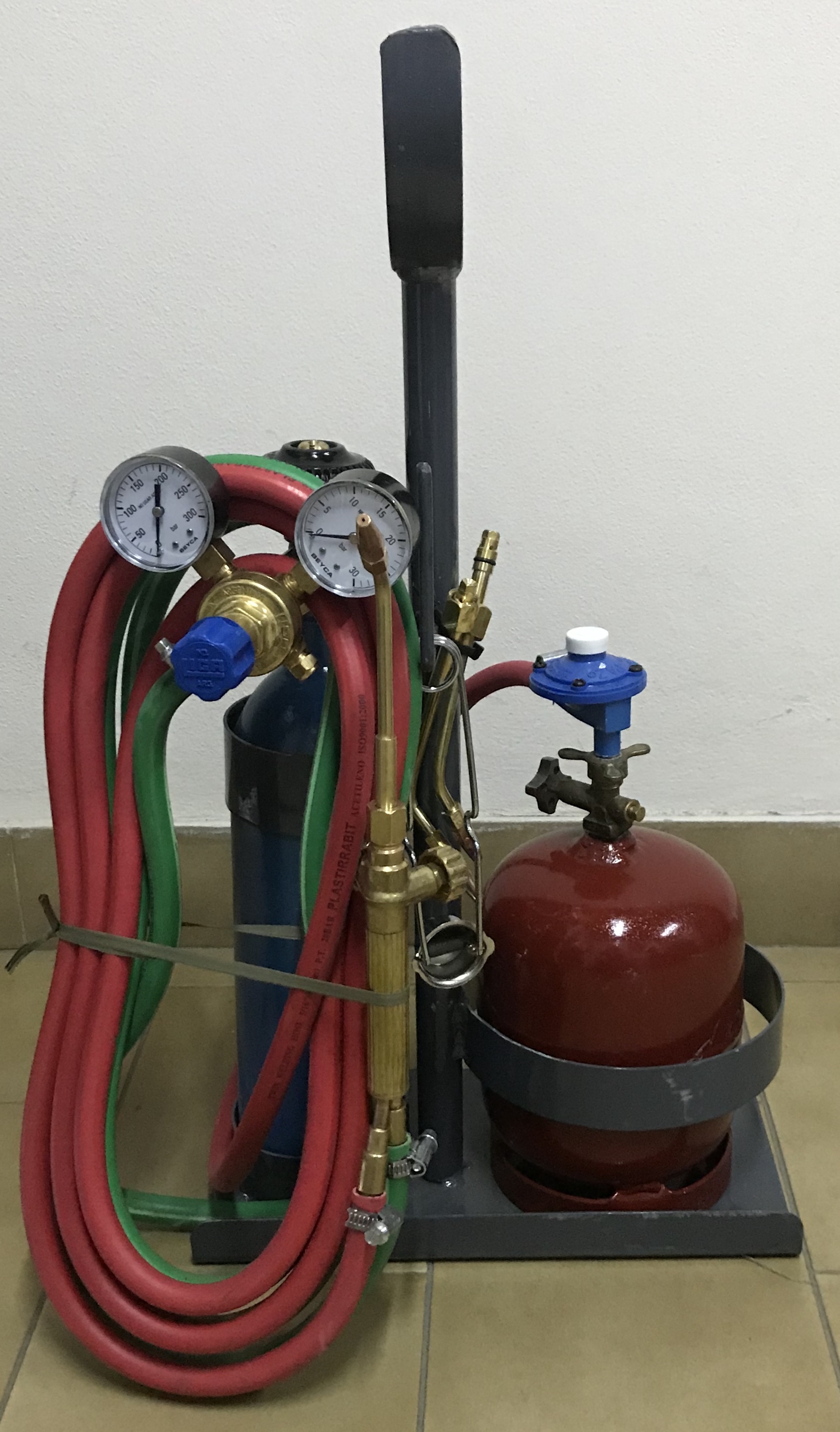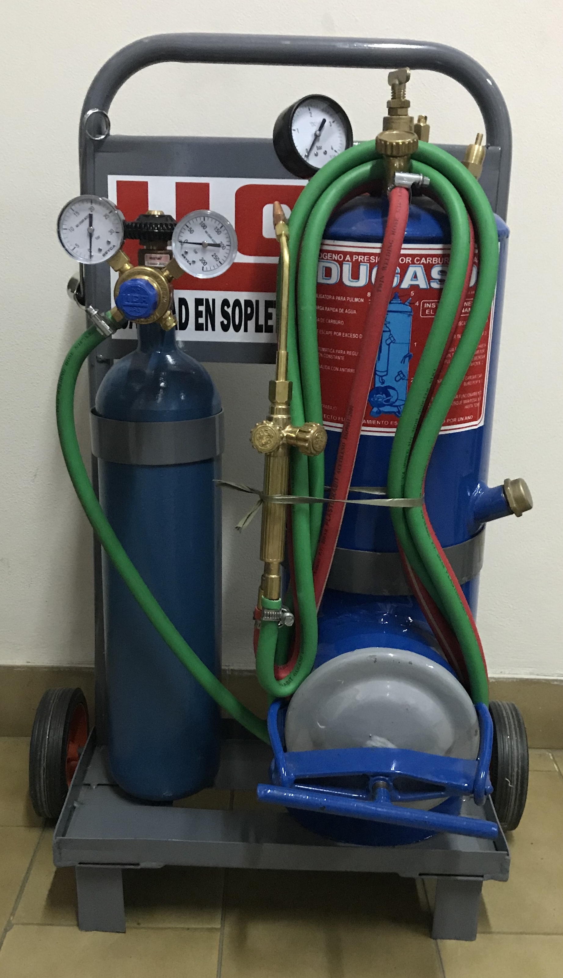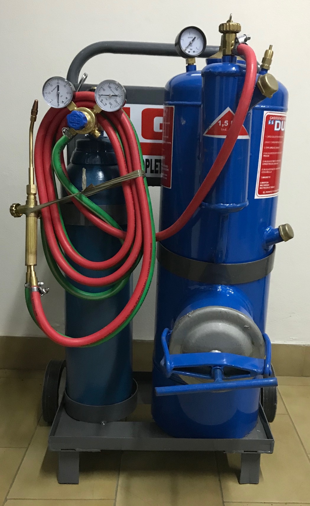 Carro porta gasógeno de 2 Kg. y tubo de oxígeno de 2 mts. c/válvula y soplete M3 completo